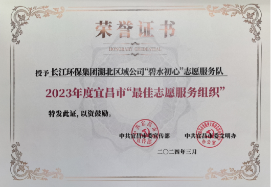 近日,三峽集團所屬長江環保集團湖北區域公司碧水初心志愿服務隊在宜昌市2023年度雷鋒志愿服務先進典型表彰評選中脫穎而出,榮獲“宜昌市2023年度最佳志愿服務組織”。