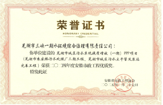 “安徽市政工程優質獎”是安徽省市政工程質量最高獎。蕪湖市城區污水系統提質增效(一期)項目是長江環保集團深度參與“共抓長江大保護”的首批重點項目,該項目由蕪湖市三峽一期水環境綜合治理有限責任公司投資建設,項目擴建一座日處理11.5萬立方米的污水處理廠,新建12.4千米污水主干管和2座污水泵站,主要服務蕪湖市鳩江區、鏡湖區等主城區,總面積約99平方千米,服務人口90萬人,項目以“‘廠-網-河-湖-岸’一體化治理、建設養護全周期、系統治理、標本兼治”為主線,通過完善管網工程,推進污水全收集、收集全處理、處理全達標,系統解決城市水環境問題,極大改善市民居住環境。