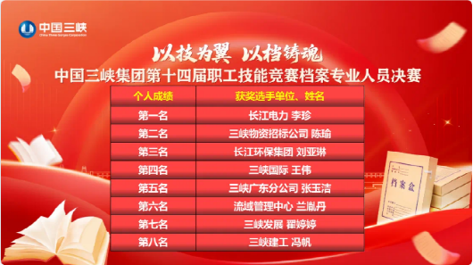 本網訊(吳茜)7月4日,集團公司第十四屆職工技能競賽檔案專業人員決賽在湖北武漢圓滿落幕,長江環保集團參賽選手憑借扎實的專業技能和精彩的現場表現,在競賽中脫穎而出。其中,安徽區域公司劉亞琳獲得競賽個人第三名,并將被授予“中國三峽集團技術能手”“中國三峽集團青年崗位能手”稱號;江西區域公司湯玉玉和安徽區域公司劉亞琳所在參賽隊伍,在“請聽檔案說”團體競賽環節排名第一,獲得“最佳展示獎”。